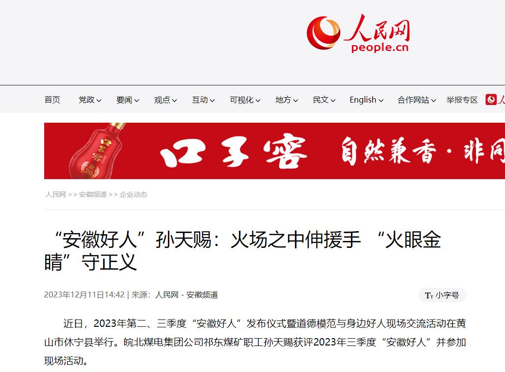 12月11日人民網(wǎng):“安徽好人”孫天賜:火場之中伸援手 “火眼金睛”守正義
